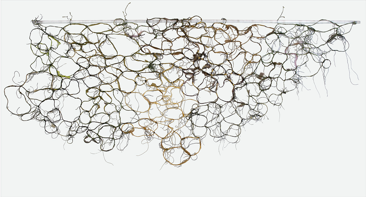 Liza Green, 'Bog pools'. Water Courses. Stitched jute, wire and organza textile hanging.